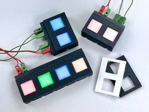 The photos show the variant in which two sensors are housed in a closed, 3D-printed housing. The (red) LED that lights up upon detection is located on the bottom of the small sensor circuit board. Thus, built into a semi-transparent enveloping building block or (splashproof) closed housing with diffuser printed from transparent material, this LED light is sufficiently visible. However, during the practical test (at the fischertechnik Südconvention) it turned out that one sometimes intuitively places the finger on the diffuser instead of slightly higher (where the detection surface is located under the lid). Fortunately, in most cases the sensor turned out to be sensitive enough to detect such a touch.