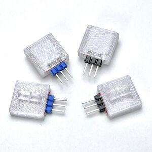 For the HTTM variant I designed and printed a box in which the sensor surface of each sensor remains visible through the lid. As with the closed variant, I also experimented with a double variant that directly houses four sensors. The idea is to use this in the future for digital experiments, where four bits can be 'programmed' per module. I made a version of both variants that works on 5 volts and can be connected with a three-pin cable, and one that uses the well-known 2.5 mm fischertechnik sockets and works on 9 volts.