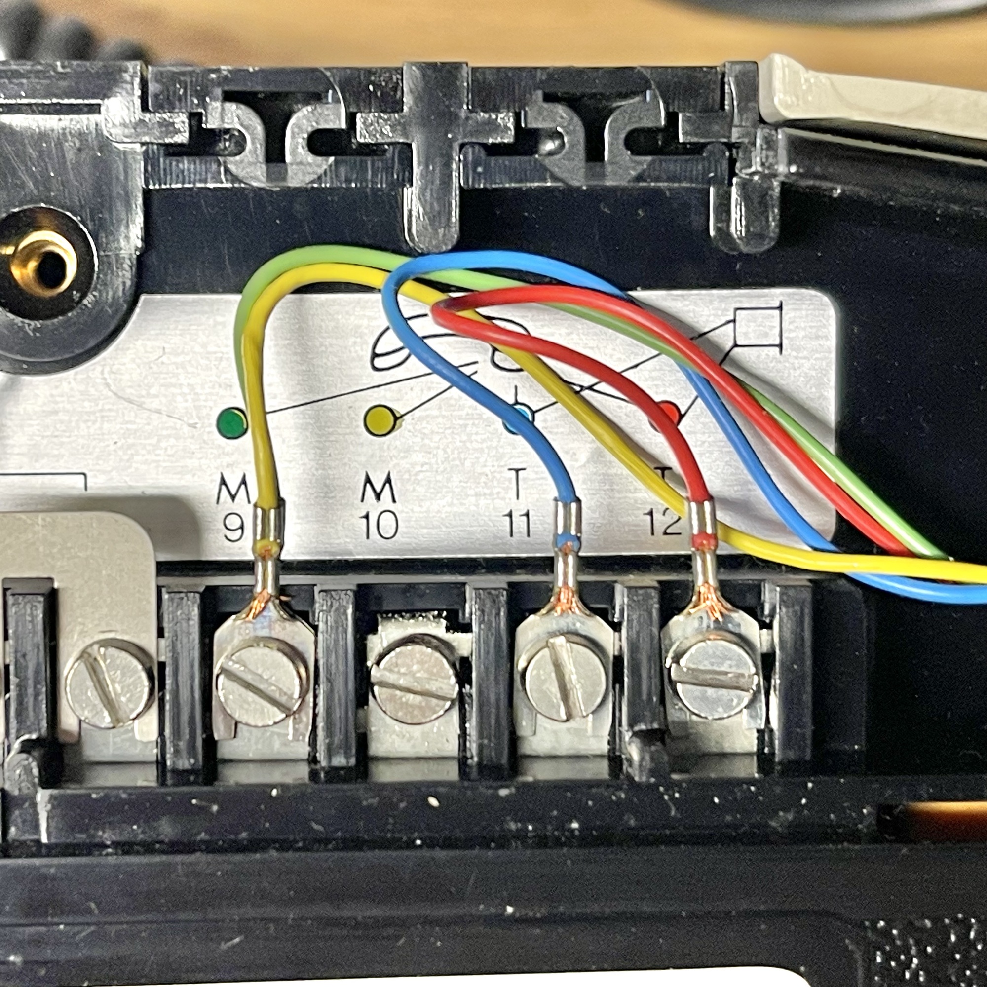 If you want to solve this in a technically neat way on the commonly used Dutch T65 telephone, you can open the cover on the bottom of the phone and connect the wire under terminal 10 (yellow) to the wire under terminal 9 (green), thereby bypassing the microphone in the handset. However, the Retrophone works perfectly well even without these modifications.