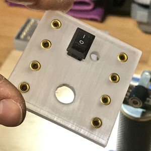 An advantage is that these spacers can easily be screwed into thin plastic, a plexiglass front or flat building block. For example, a handy on/off switch can easily be made with a Flachstein 30 with V-Riegel (31013). The connecting wires can be soldered to a solder lug inside or on the back. They can also be melted or glued quite easily into a pre-drilled front, after which the printed circuit board can be soldered directly to the back of the front. I used this method for a DIY flip-flop in a fischertechnik cassette (35359).