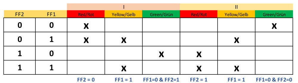 In het vorige deel, concludeerden we dat het een verdere verbetering zou het zijn als de vier regelcyclus-stappen elkaar gegarandeerd naadloos zonder afwisselen zonder ongedefinieerde en ongewenste tussen-momenten of overlap. De basisgedachte is dat de vier verschillende regelcycli elektronisch doorlopen worden waardoor een splitsing tussen de regelfasen en de uiteindelijk ‘gedecodeerde’ lampcombinaties gemaakt kan worden. Dit is mogelijk door een teller die van 1 tot 4 (of van 0 tot 3) telt en een aparte ‘decoder’ met logische poorten.