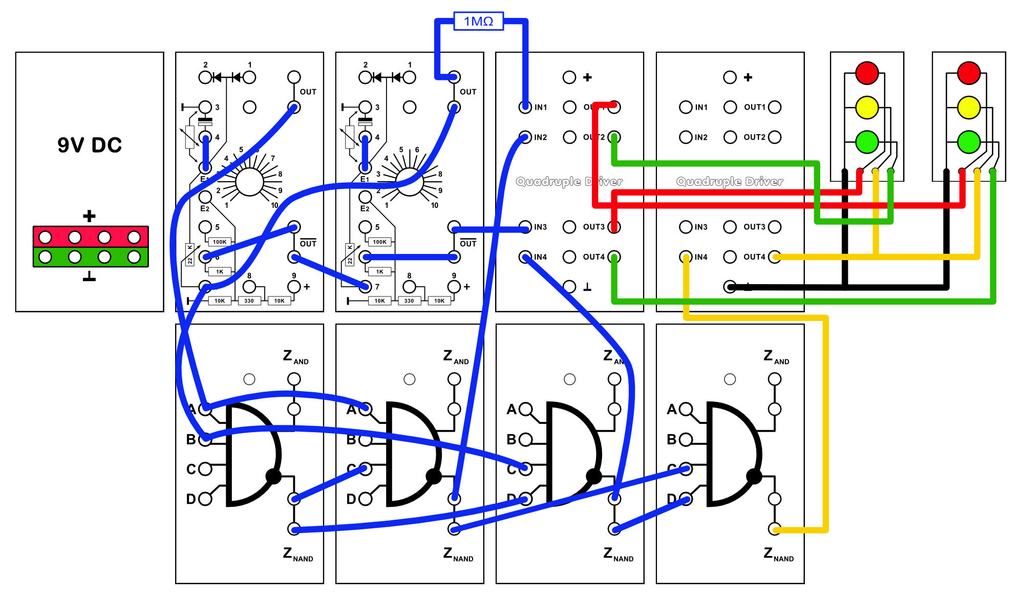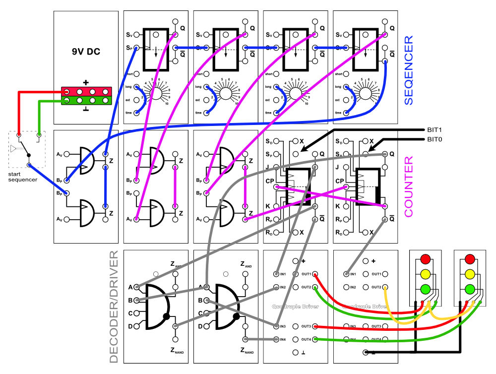 De verkeersregeling is, net als bij de elektromechanische oplossing, gesplitst in een vierstaps teller en aparte lampen-decoder. Bijkomend voordeel van deze elektronische variant is echter de strakke definitie van de vier verschillende fasen. Er is echter nog steeds weinig controle over de onderlinge tijdsduur van de verschillende stappen.